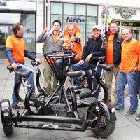 Mit dem ConferenceBike wurde die Fahrradtour neu erfunden. Bei dieser rollenden Party sitzen sieben Radler im Kreis um einen Tisch und sehen sich an. Der Fahrer und Pilot sitzt in Fahrtrichtung. Er überschaut die Runde, lenkt und bremst. Alle sitzen auf Sätteln und treten gemeinsam in die Pedale. Hier wird der Spaß zum Motor! Das Bike ist rechtlich ein Fahrrad und darf auf öffentlichen Strassen gefahren werden. Sie können das Bike mit und ohne Fahrer mieten. Wir liefern selbstverständlich das Bike auch zu Ihrer Veranstaltung oder Ausflugsfahrt an. |