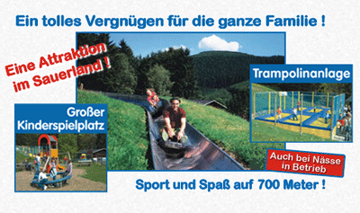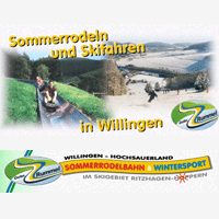 ![]() Eine besondere Attraktion im vielfältigen Freizeitprogramm des Kur- und Ski-Weltcuportes Willingen Sommerrodelbahn Willingen Tausende Besucher aus Nah und Fern haben diesen 700 Meter langen Rodelspaß bereits genossen. Mit ihren elf rasanten Kurven und drei Jumps und mehreren langgezogenen Geraden ist sie sicherlich eine der abwechslungsreichsten Bahnen ihrer Art. Allein der Bergauf-Transport ist schon einen Besuch wert. Mit Hilfe des vorhandenen Skilifts wird der Gast auf dem Schlitten sitzend bergauf gezogen, oben angekommen genießt der Besucher einen herrlichen Blick auf Willingen und kann ohne abzusteigen in die "Bergabbahn" einfahren und die Talfahrt auskosten. Jeder kann rodeln, wie er möchte, ob alt, ob jung, allein oder zu zweit. Bei einer Geschwindigkeit von bis zu 45 km/h geht es hinab ins Tal, wobei jeder sein Tempo selbst bestimmen kann.